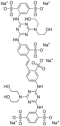 - 英文名称:hexasodium 2-[[4-(bis(2-hydroxyethyl)amino)-6-[[4-[(E)-2-[4-[[4-(bis(2 -hydroxyethyl)amino)-6-[(2,5-disulfonatophenyl)amino]-1,3,5-triazin-2- yl]amino]-2-sulfonato-phenyl]ethenyl]-3-sulfonato-phenyl]amino]-1,3,5- triazin-2-yl]amino]benzene-1,4-disulf..